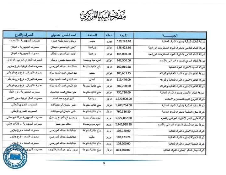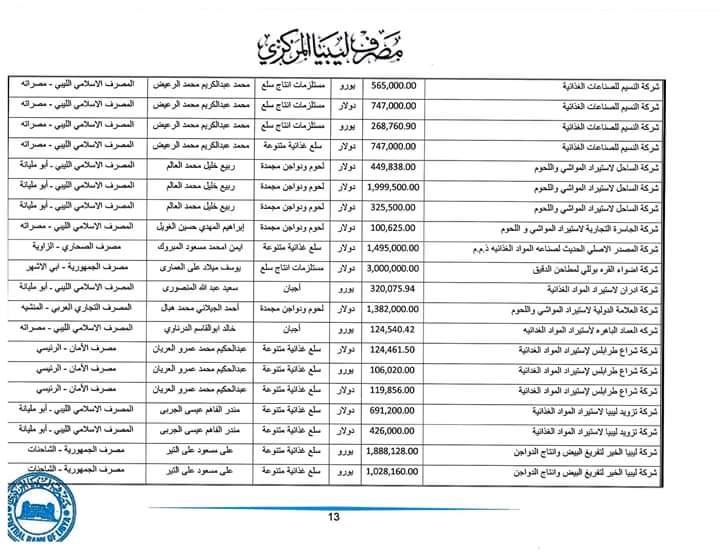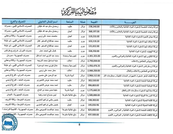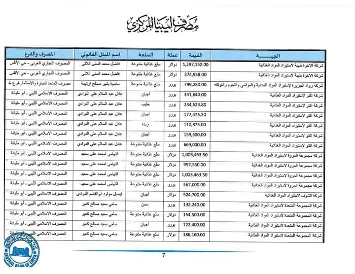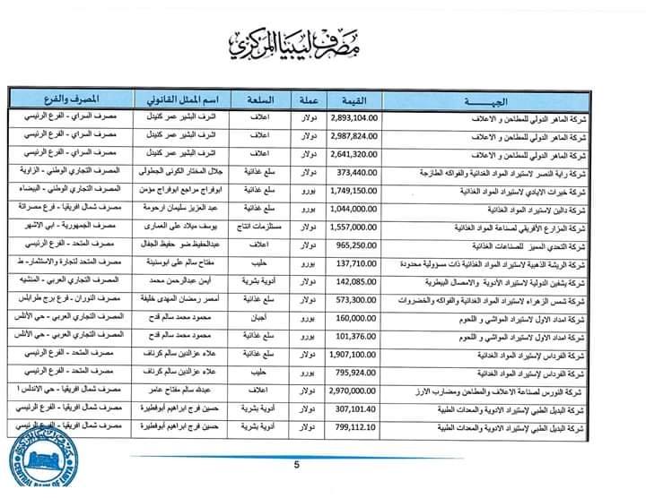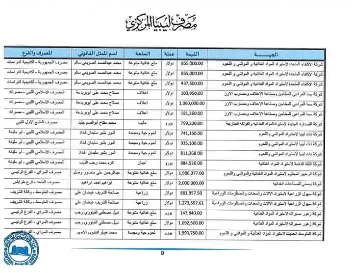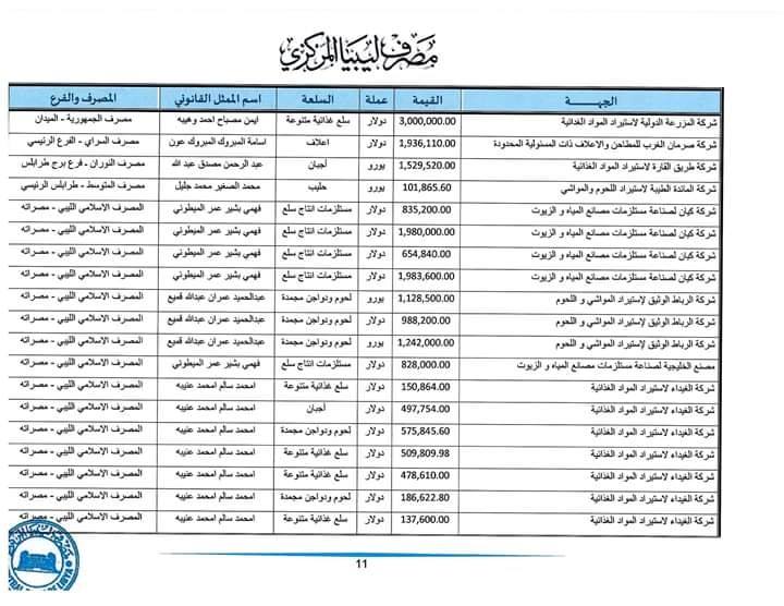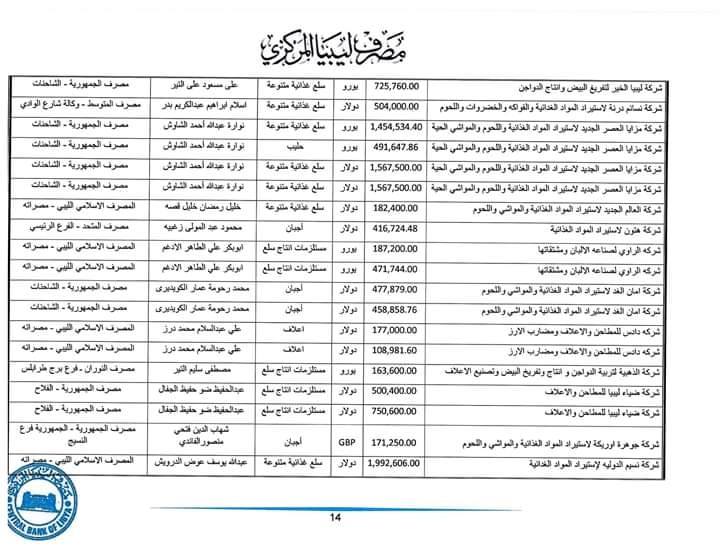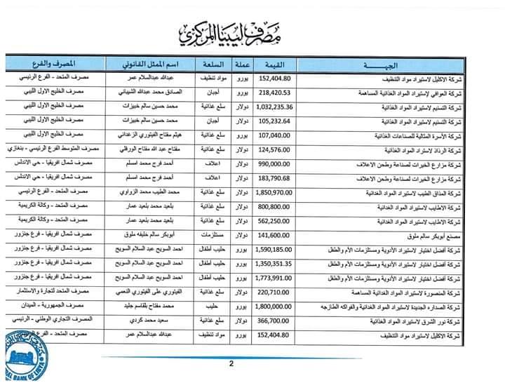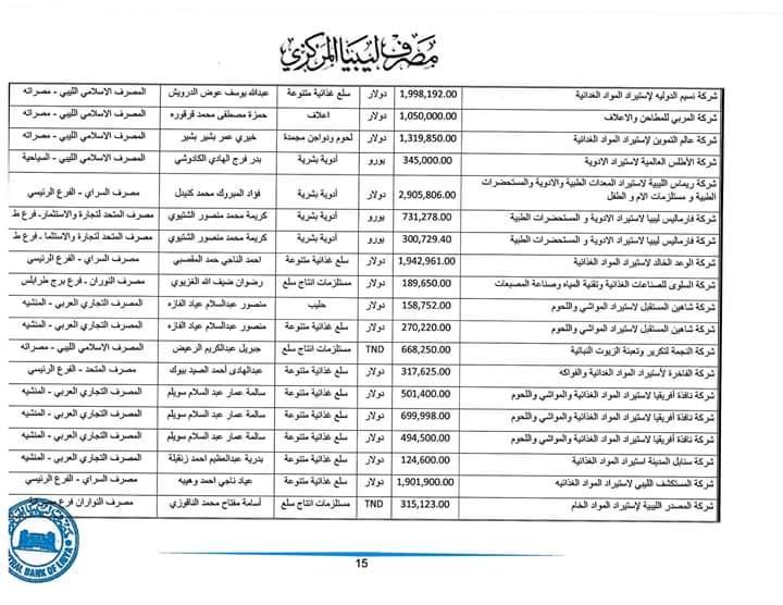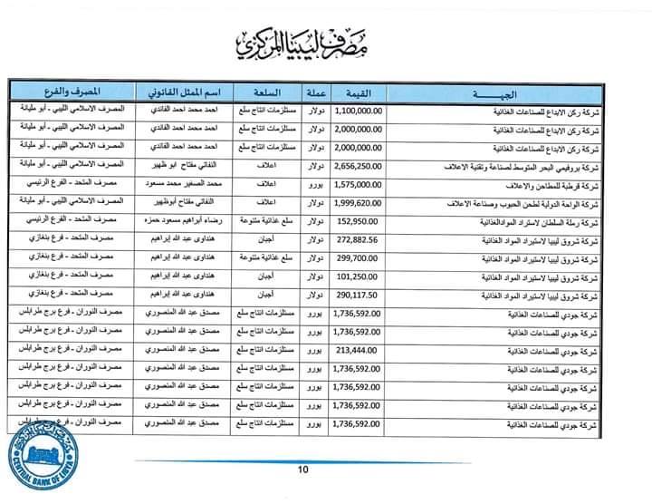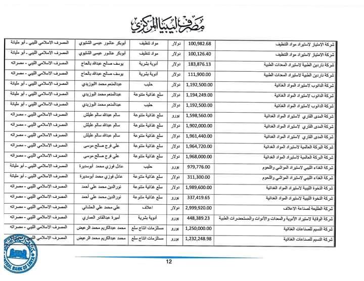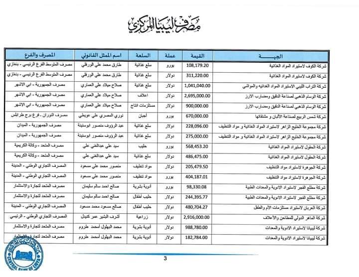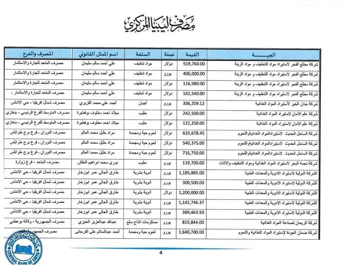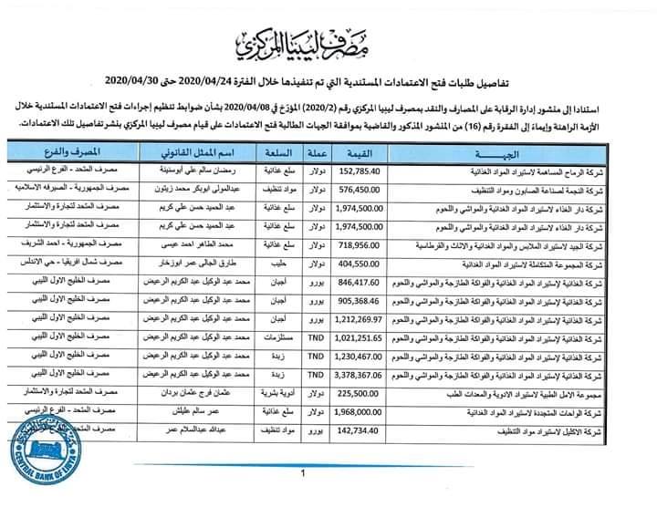 وجاء بيان (مصرف ليبيا المركزي بطرابلس) كالتالي : تفاصيل طلبات فتح (الاعتمادات المستندية) التي تم تنفيذها خلال الفترة من 2020/4/24 حتى 2020/4/30 استنادا إلى منشور (إدارة الرقابة على المصارف والنقد بمصرف ليبيا المركزي) رقم (2/2020) المؤرّخ في 2020/4/8 بشأن ضوابط تنظيم إجراءات فتح (الاعتمادات المستندية) خلال “الأزمة الراهنة” وإيماء إلى الفقرة رقم (16) من المنشور المذكور والقاضية بموافقة الجهات الطالبة فتح الاعتمادات على قيام ((مصرف ليبيا المركزي)) بنشر تفاصيل تلك الاعتمادات المفتوحة كما.